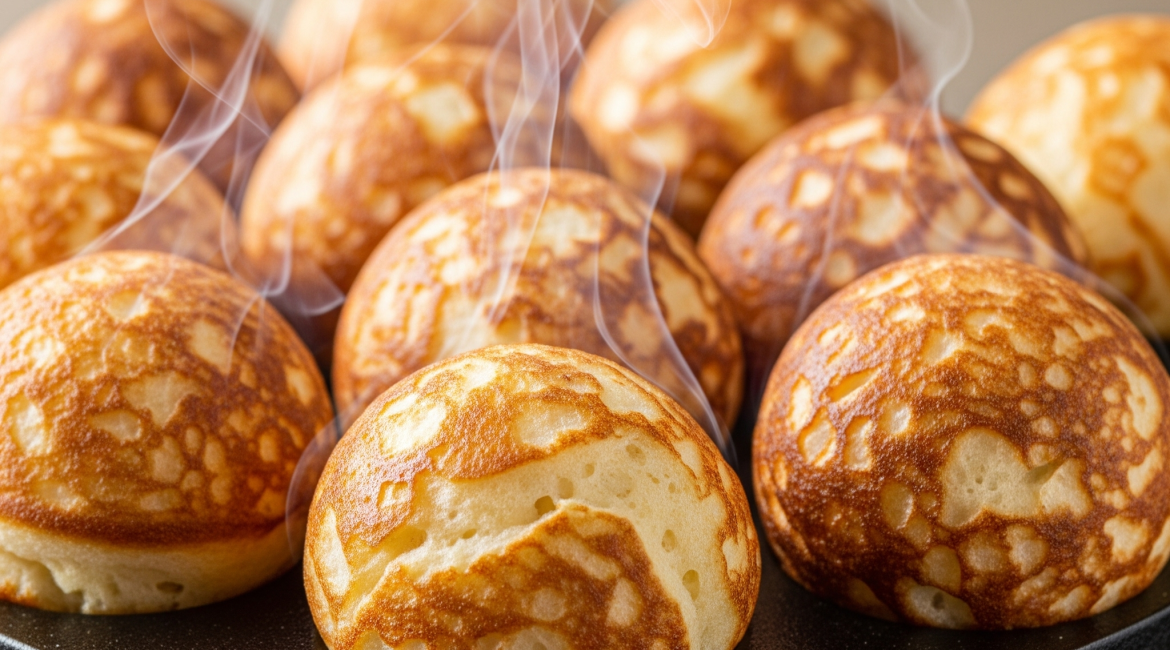 - Heat an aebleskiver pan over medium heat. Put about 1 tablespoon vegetable oil in the bottom of each cup. Fill each cup between ⅔ and ¾ full. As soon as bubbles appear around the edges, turn them quickly about half way to the side. After that side has cooked, pull it directly up. (Danish cooks use a long knitting needle, but a fork will work.) Continue cooking, turning the ball to keep it from burning.