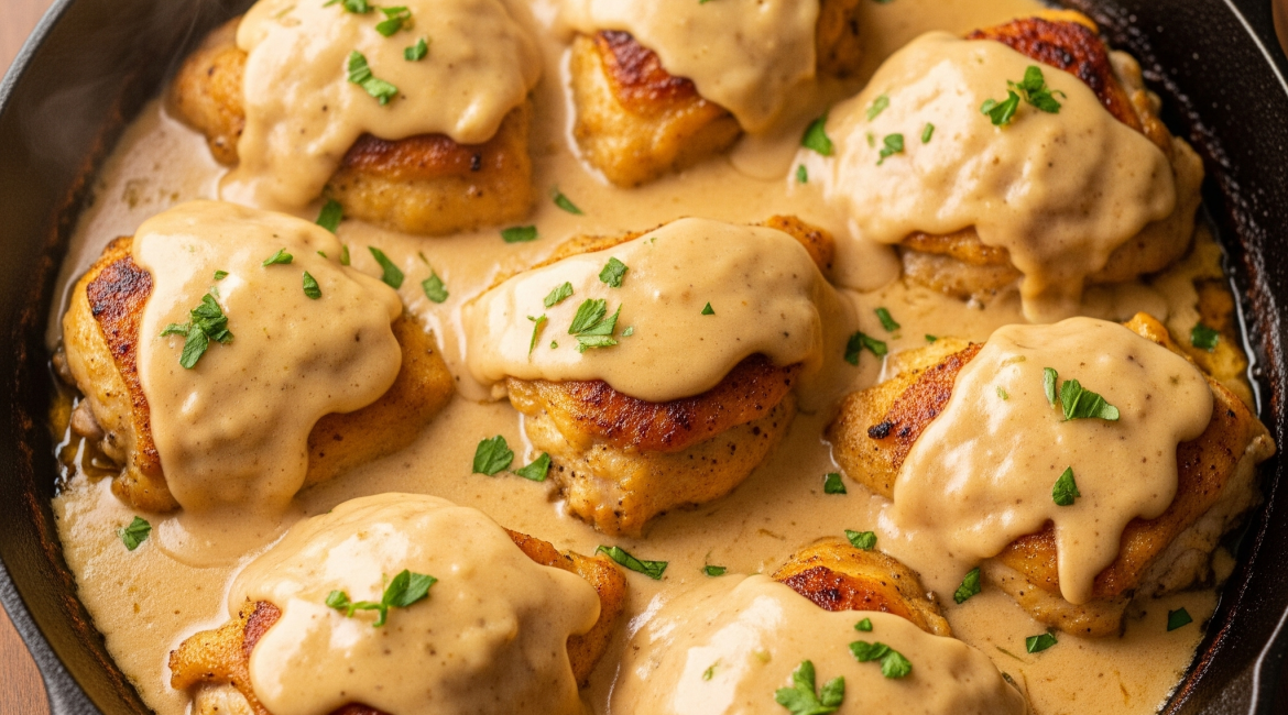 - A pan of gravy next to a pot of Smothered Chicken topped with bacon. Pro tip to Control the Consistency of the Gravy: