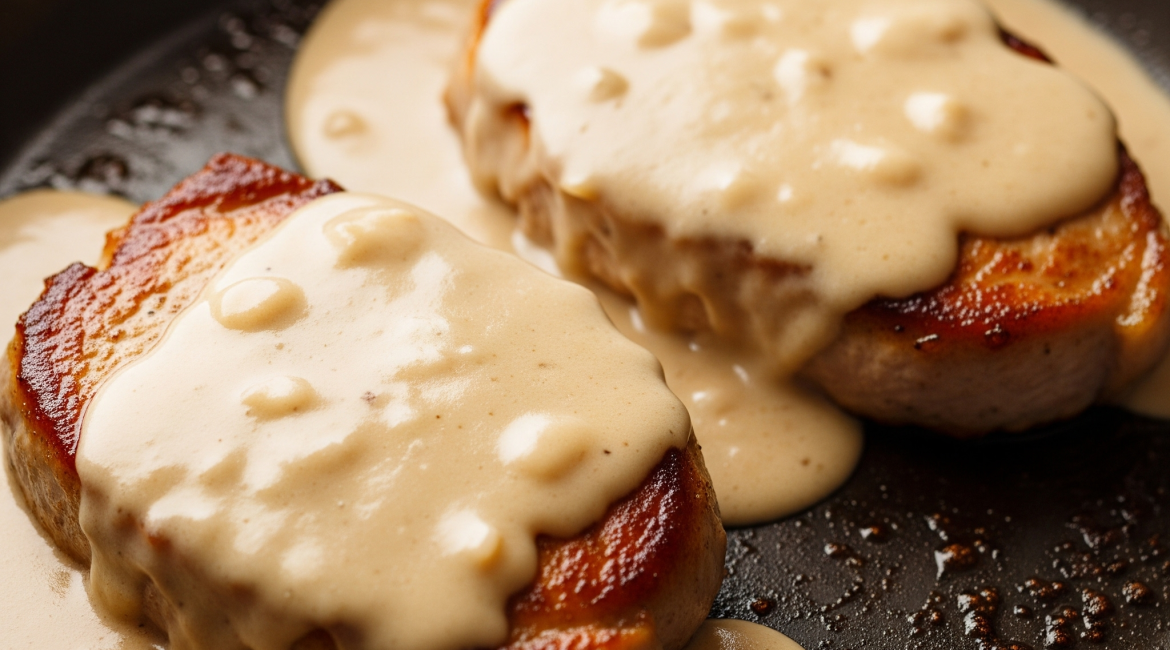 - Remove pork chops from the pan and keep warm. Gravy